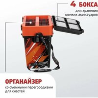 Основной отсек предназначен для переноски рыболовных снастей, термоса, так же удобен для перевозки улова. На внутренней стороне крышки размещены 4 отделения с полупрозразчными крышечками для хранения мелких аксессуаров.