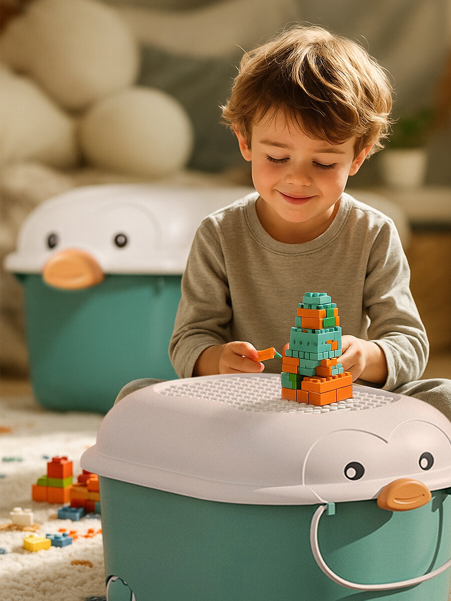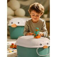 Крышка оснащена креплением-основой под конструкторы с крупными блоками: диаметр креплений — 0,9 см, расстояние между ними — 0,7 см. Подходит для LEGO Duplo (лего дупло) и аналогичных серий. Крышку можно использовать как игровую зону. Сундук способствует развитию самостоятельности — ребёнок сможет сам собирать игрушки, открывать и катить тележку.
