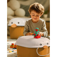 Крышка оснащена креплением-основой под конструкторы с крупными блоками: диаметр креплений — 0,9 см, расстояние между ними — 0,7 см. Подходит для LEGO Duplo (лего дупло) и аналогичных серий. Крышку можно использовать как игровую зону. Сундук способствует развитию самостоятельности — ребёнок сможет сам собирать игрушки, открывать и катить тележку.