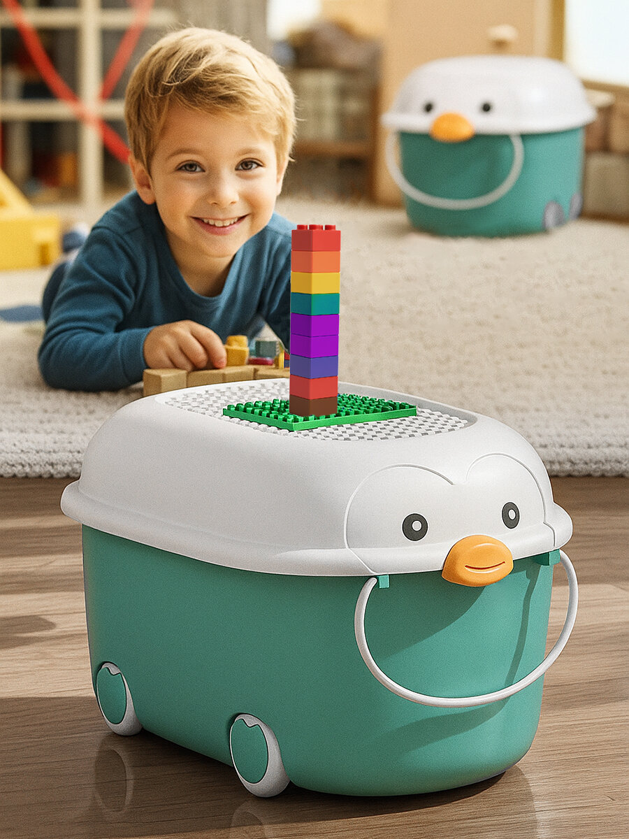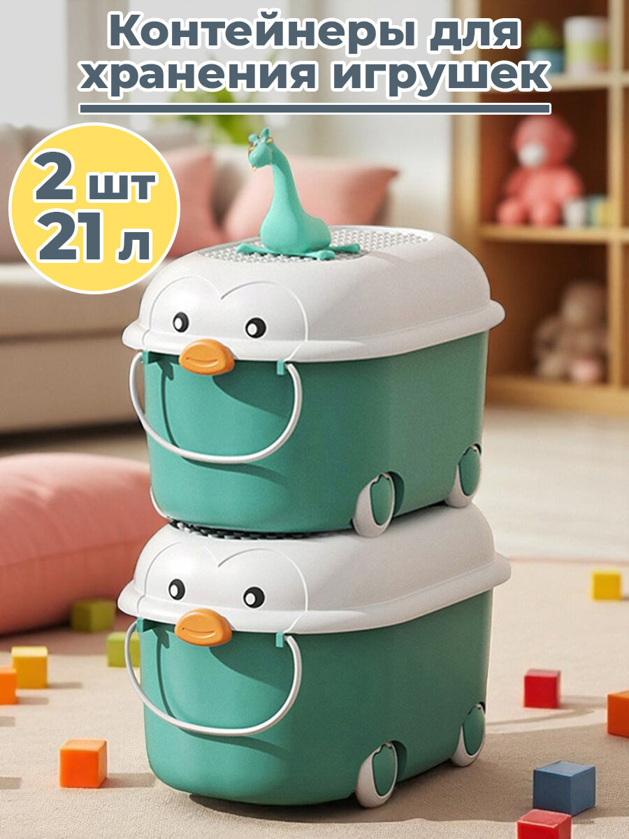 Набор из 2 ящиков для хранения игрушек в виде пингвина — это не только практичный, но и оригинальный элемент интерьера детской комнаты. Контейнеры выполнены в бирюзовом цвете и стилизованы под забавных пингвинов, что их привлекательным как для мальчиков, так и для девочек. Благодаря яркому дизайну уборка становится увлекательной игрой, а сами органайзеры — украшением комнаты (прим. StarFriend).