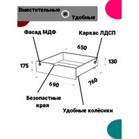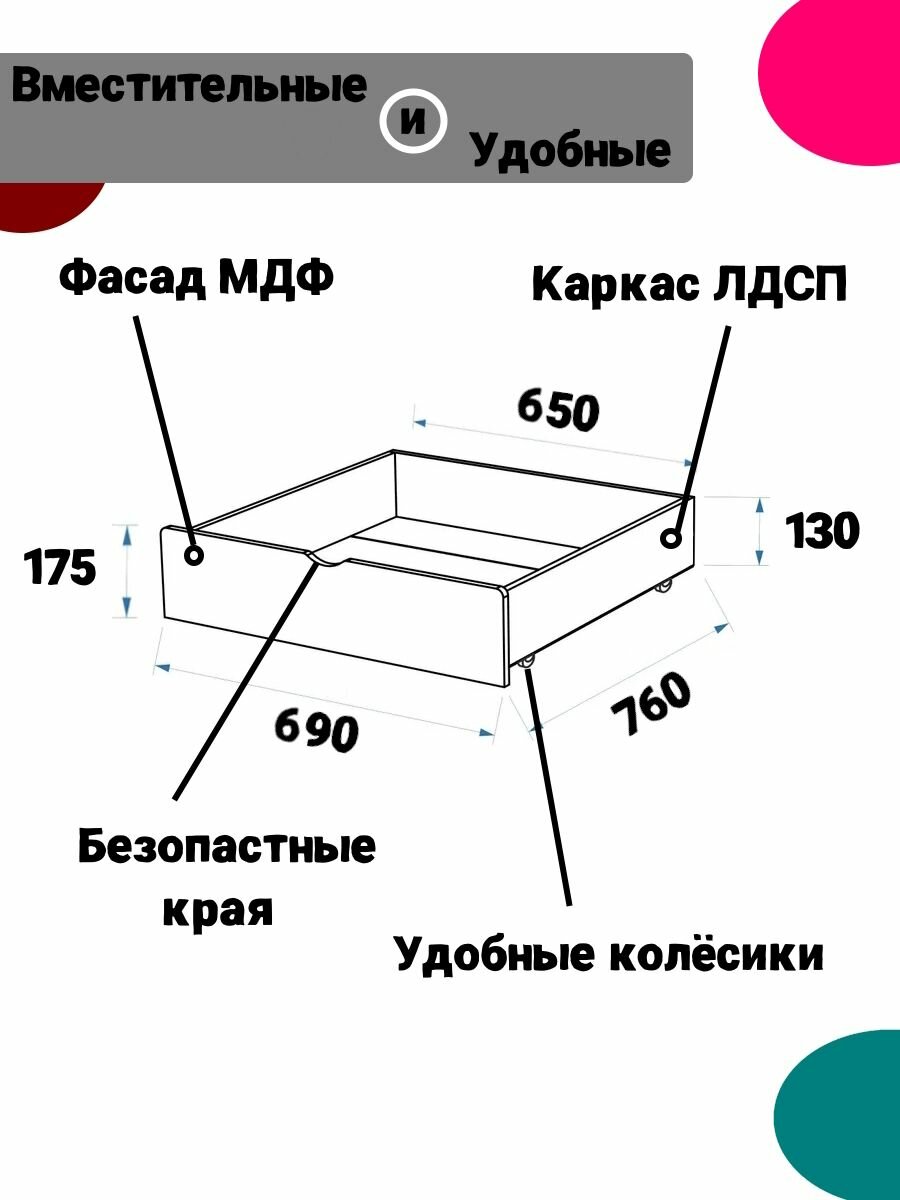 Стоимость указана за ДВА ящика. Подкроватные ящики для хранения вещей, белья и игрушек подходят для всех кроватей длинной 1400мм. Фасады ящиков изготовлены из МДФ. Подкроватные ящики имеют колёсики для лёгкого и свободного выдвижения. Очень вместительные, практичные и удобные в повседневном использовании.