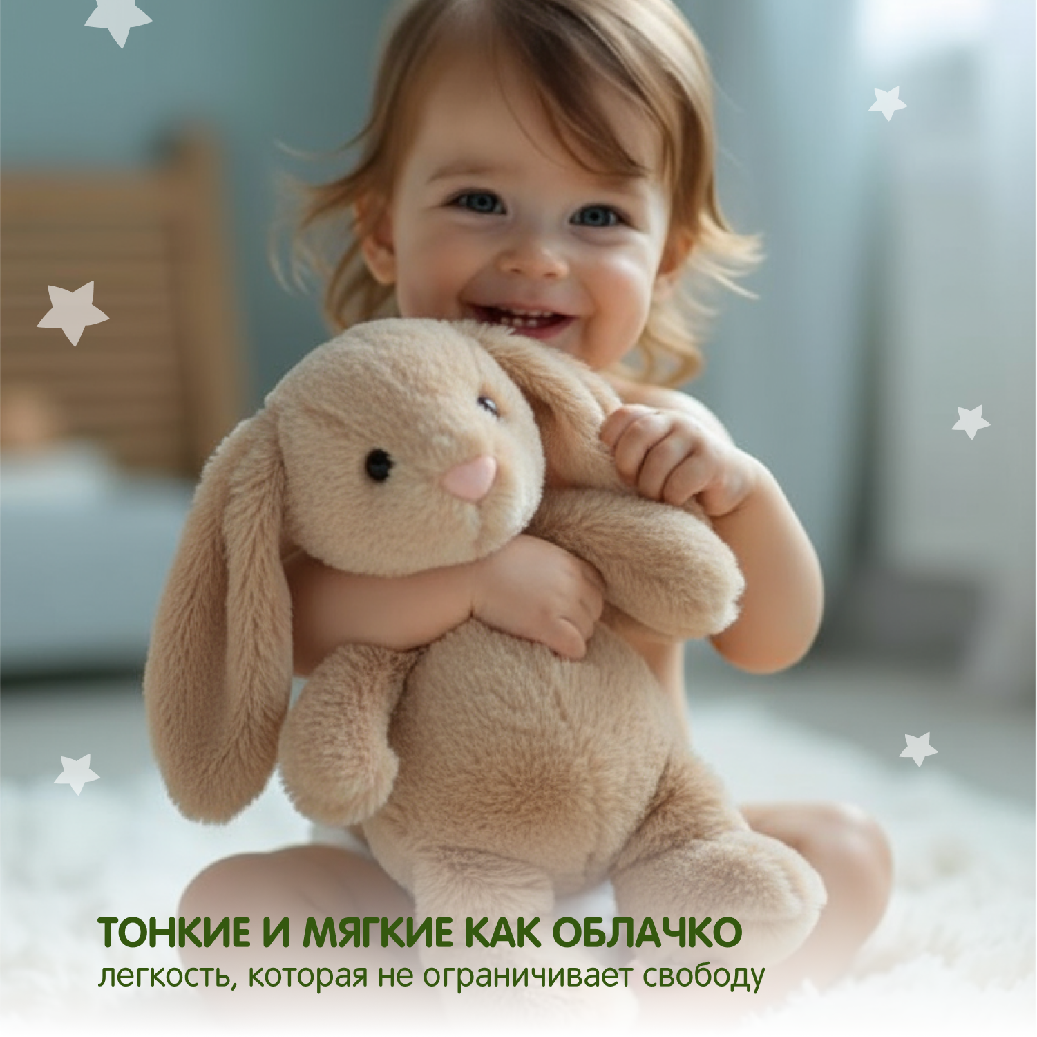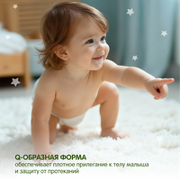 эластичные резинки вокруг ножек, многоразовые застежки-липучки, эластичный пояс, боковые внутренние бортики, индикатор наполнения, рельефная внутренняя поверхность, эко-подгузники
