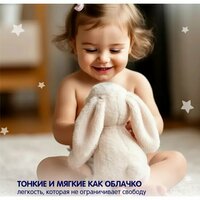 эластичные резинки вокруг ножек, многоразовые застежки-липучки, эластичный пояс, боковые внутренние бортики, индикатор наполнения, рельефная внутренняя поверхность, эко-подгузники, большая упаковка