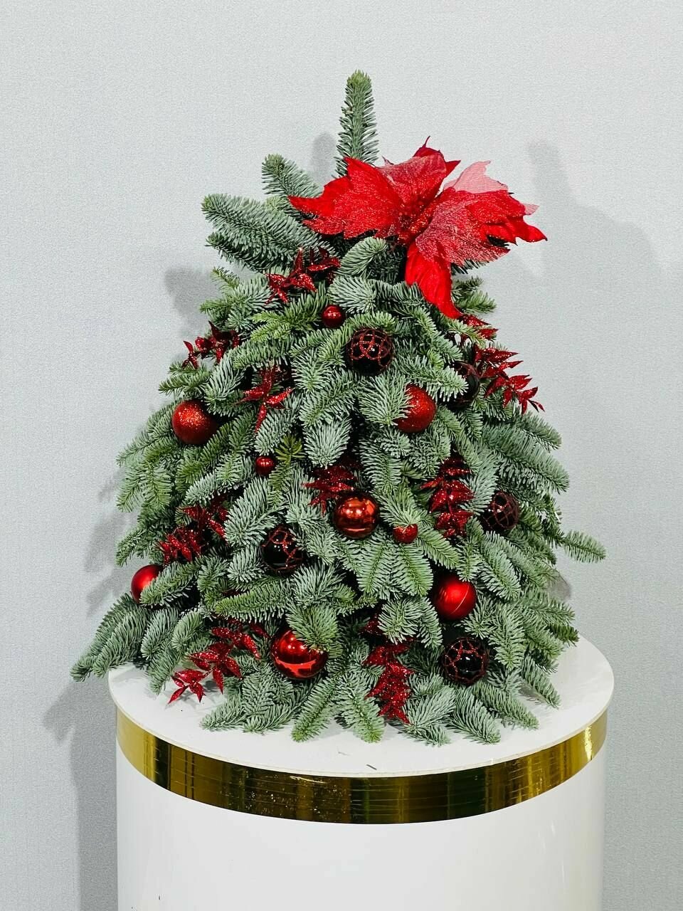 Купить Ёлочка живая наряженная 50 см из натурального нобилиса с красным декором с доставкой по всей России.