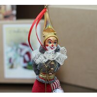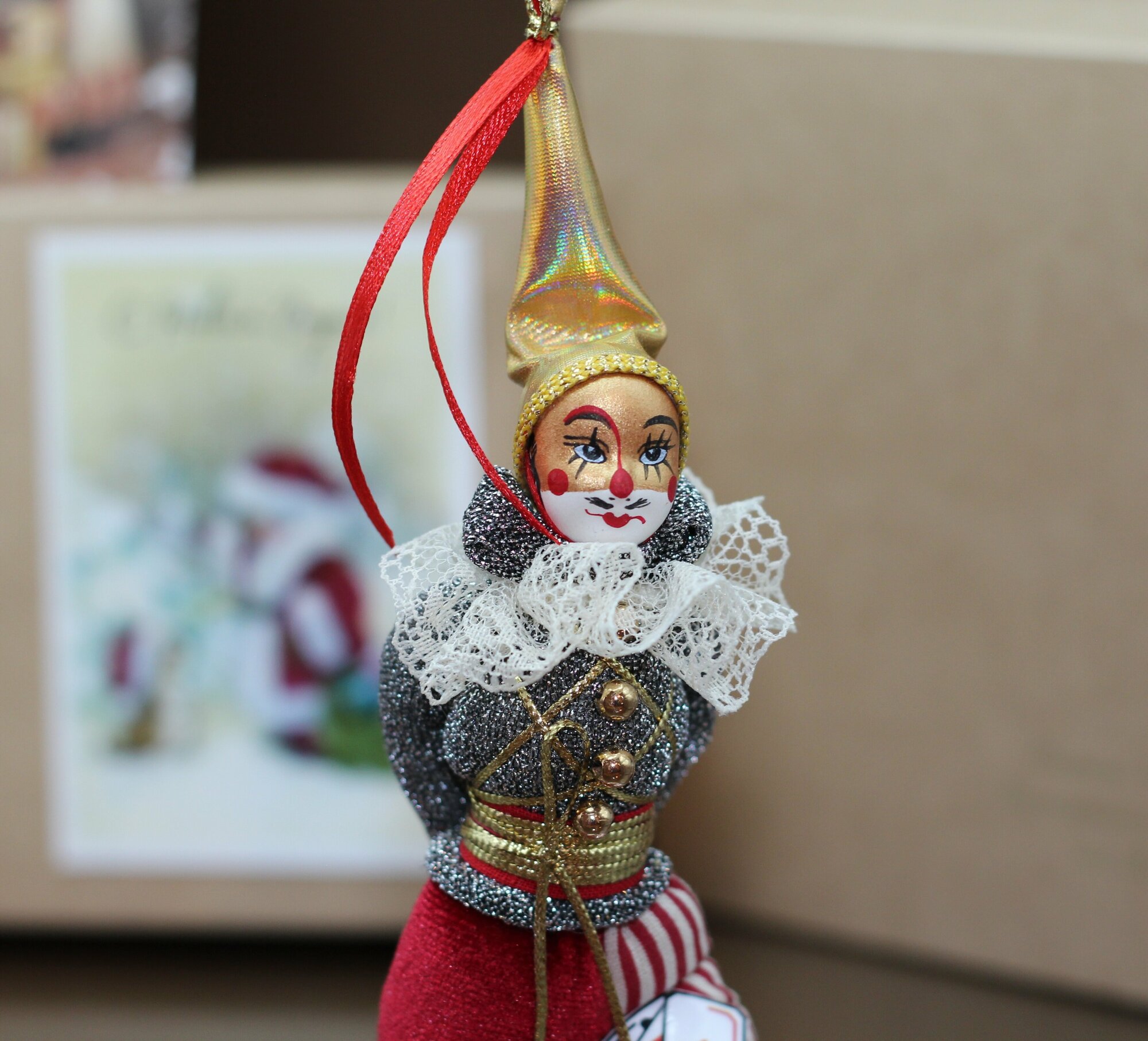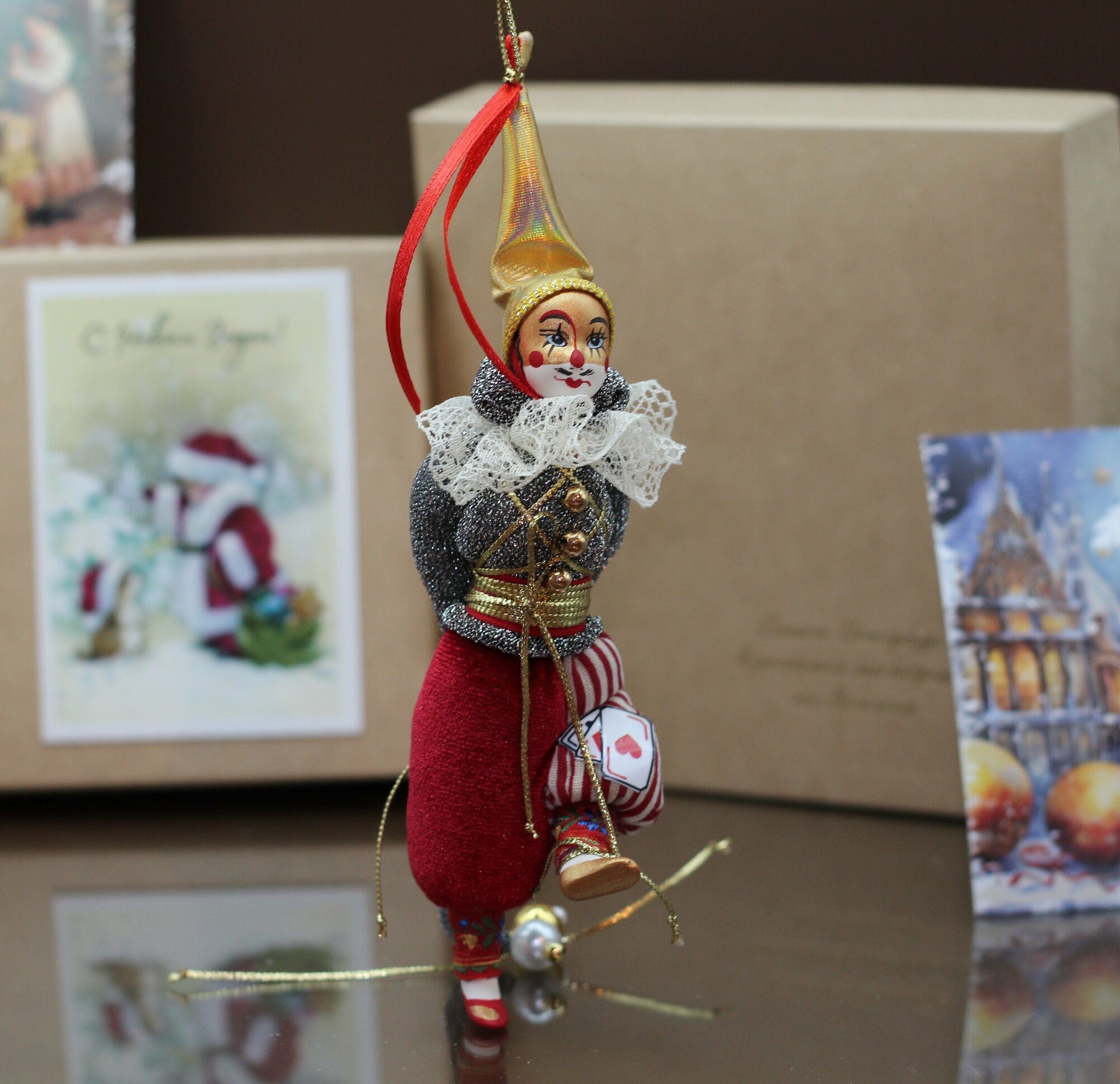 Кукла подвесная "Джокер" из серии "Клоуны", изготовлена вручную, тело текстильно-набивное, голова и ножки куклы выполнены из бисквитного фарфора и расписаны акриловыми красками. Наличие золотой маски подчеркивает принадлежность к маскарадному костюму. Ножки мягкого набивного тела зафиксированы в танцующей позе. Для костюма использованы различные ткани: хлопчатобумажная полосатая и бархат для штанин, блестящий трикотаж для кофточки, золотая парча для колпачка, а так же жаккардовая тесьма, кружево, атласные ленты и золотые шнуры. Не смотря на вольную трактовку костюма карточного Джокера мы легко узнаем его по наличию игральных карт, которые он придерживает приподнятой коленкой. Ширина6 смВысота15 смВес (г.)40