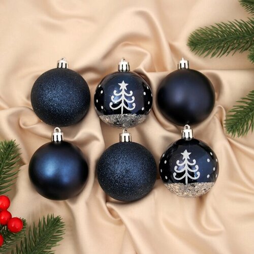 Синий набор ёлочных шаров диаметром 6 см объединяет элементы в стиле фьюжн и ар-деко, создавая выразительный и современный праздничный декор. Каждый шар украшен изящным рисунком, который подчёркивает глубину цвета и придаёт ёлке особую атмосферу.