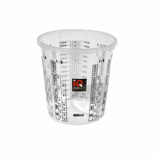 Высококачественные и стойкие к растворителям пластиковые мерные ёмкости IQ 400 мл используются для смешивания в различных пропорциях лакокрасочных и подготовительных материалов с отвердителями и разбавителями.