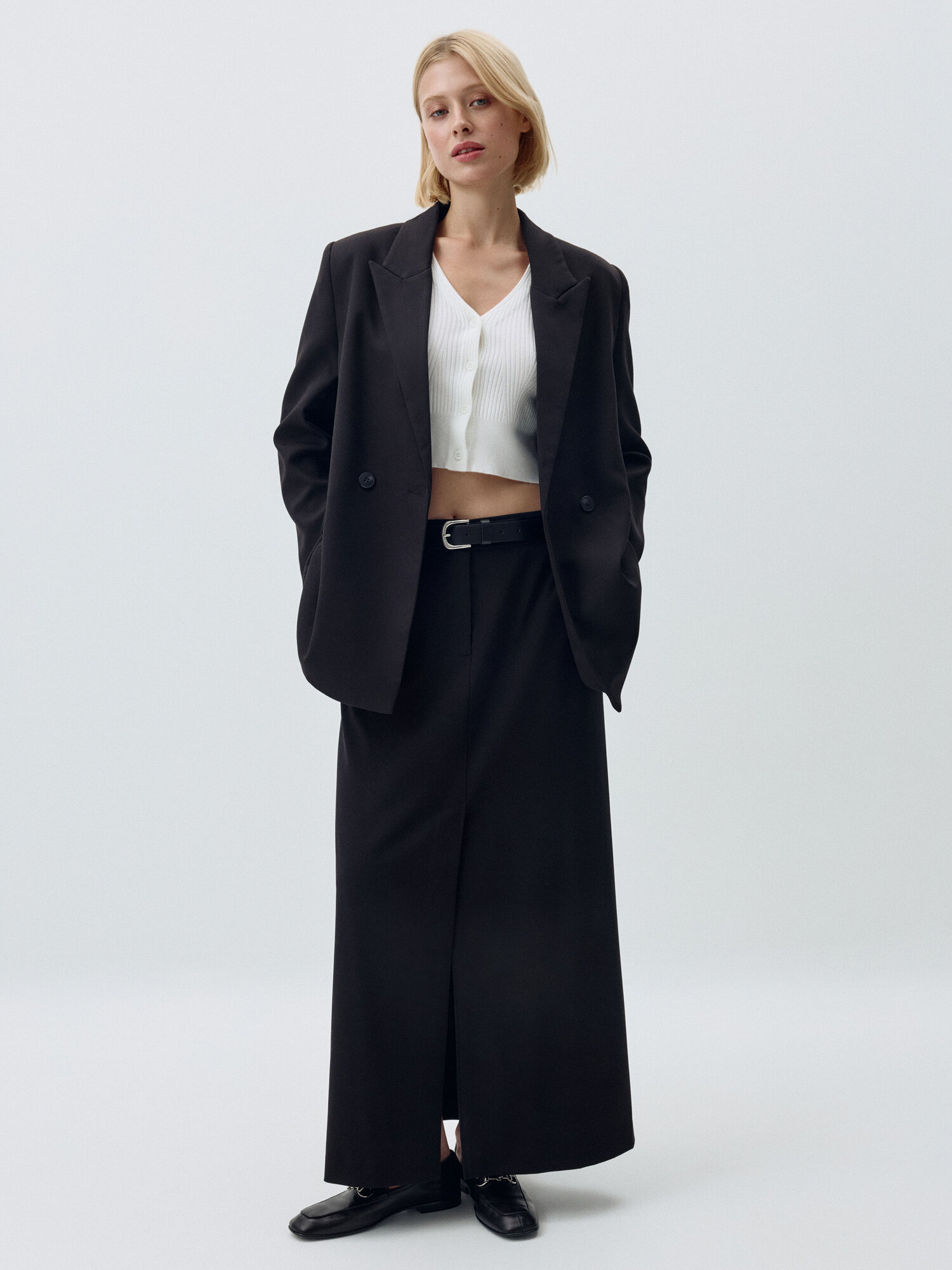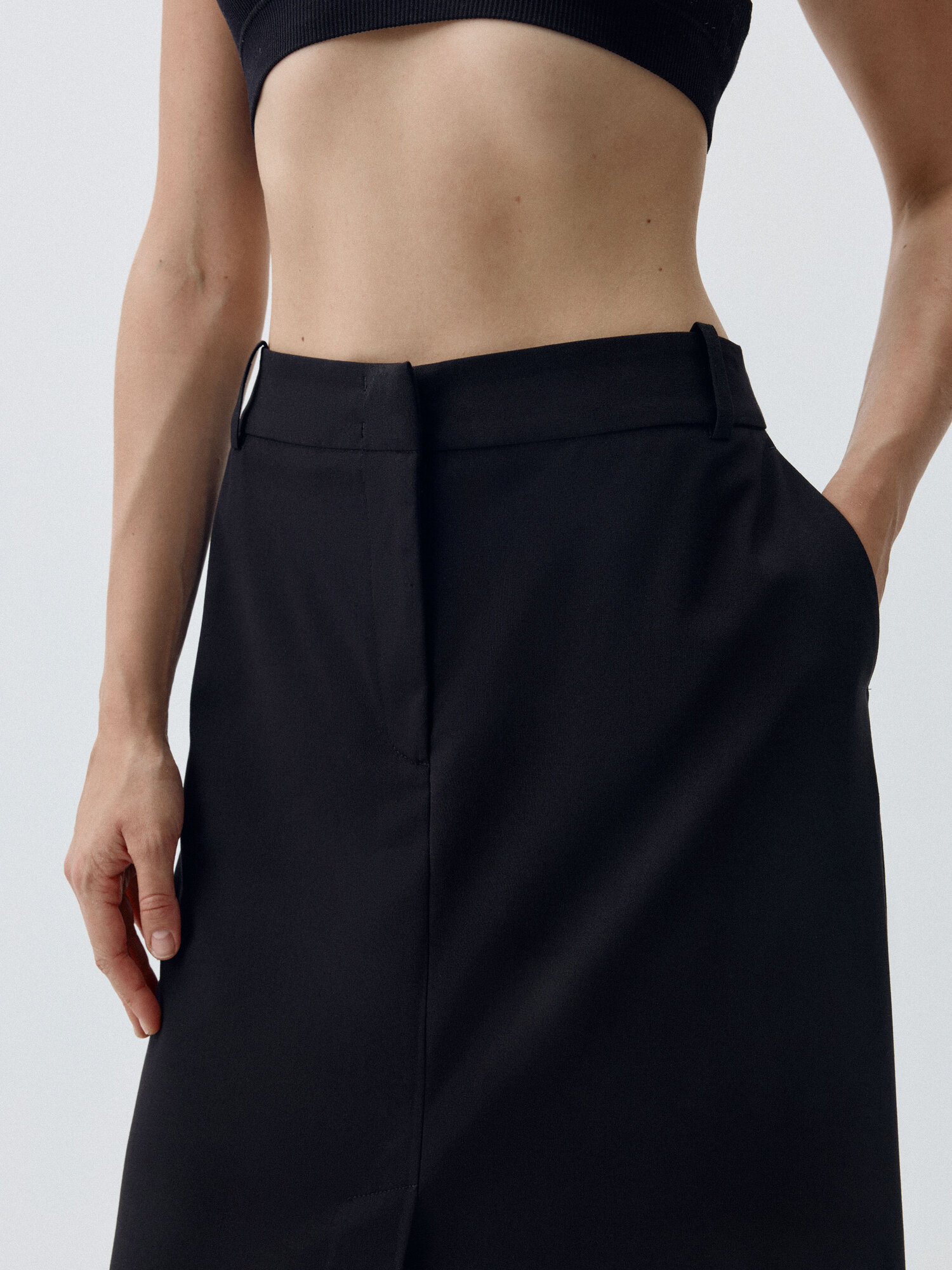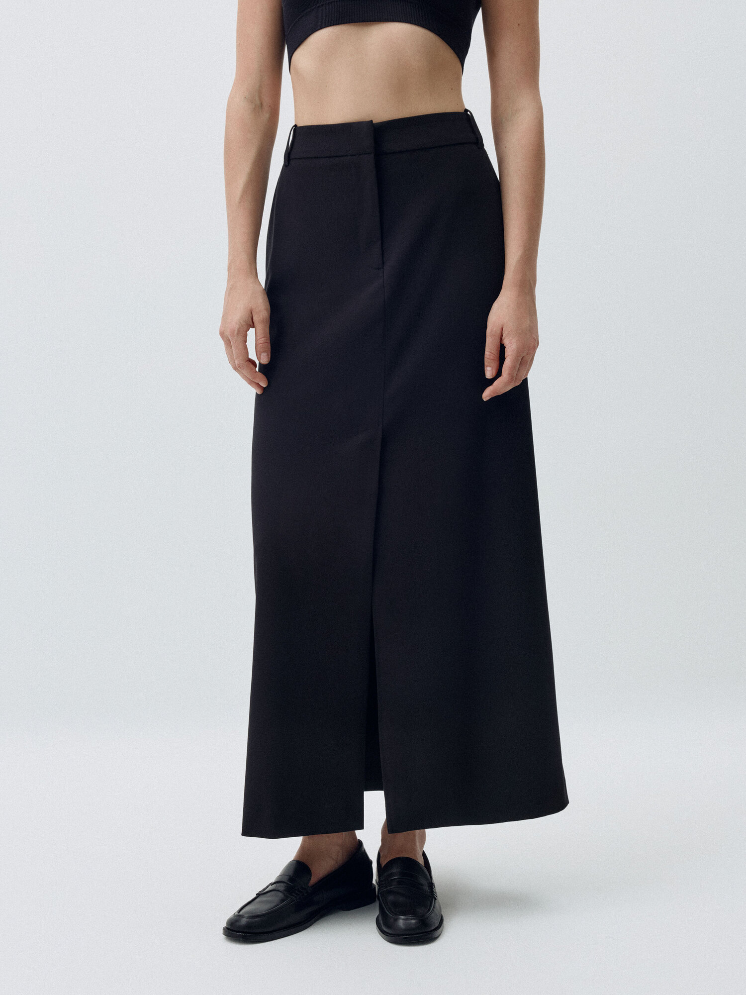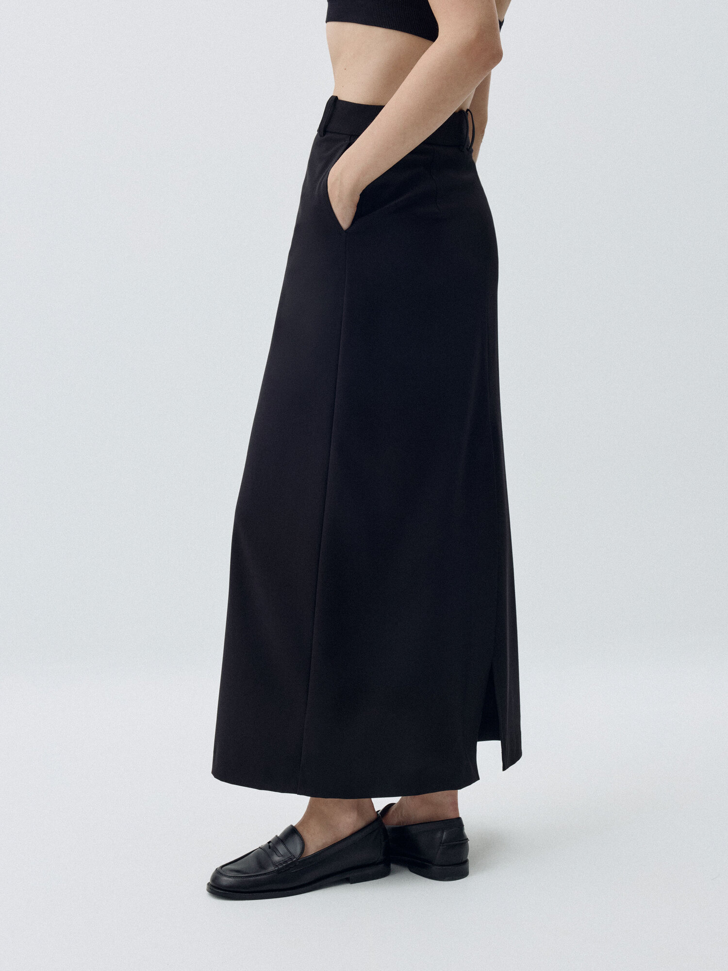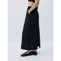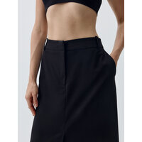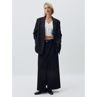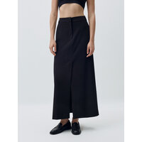 Юбка длины макси с легким расклешением к низу, на средней посадке из мягкой костюмной ткани с добавлением шерсти. Передние боковые карманы. Застёжка на молнию, крючки и внутреннюю пуговицу. Спереди и сзади в центральных швах располагаются шлицы. Со шлёвками под ремень.