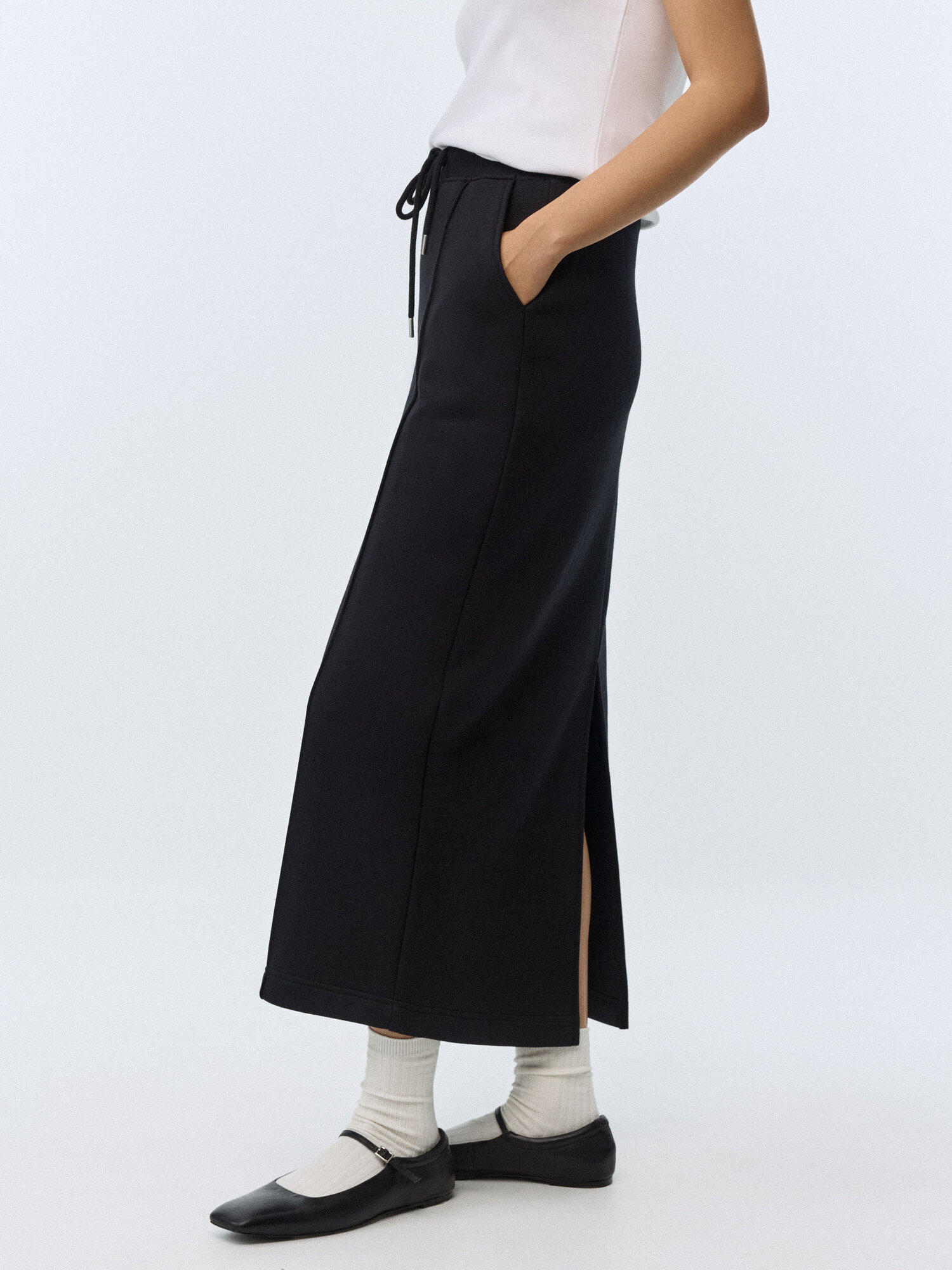 Силуэт прямой, длина миди, юбка оснащена карманом, что делает ее удобной для хранения мелочей. Застежка на завязки обеспечивает простоту и быстроту надевания и снимания юбки.