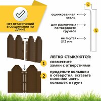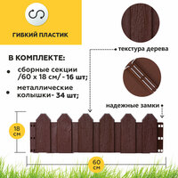 Комплект: Сборные секции из 16 штук(общая длина 9,6м.), металлические колышки (оцинкованная сталь) 34шт, толщина 3мм Цвет: коричневый Толщина пластика: 2мм Размер 1 секции: длина 60см, высота 18см. Заборчик садовый прост в установке, не требует специальных навыков или инструментов. Удлинённые колышки легко входят грунт и крепко фиксируют составные секции, делая конструкцию устойчивой к сильным ветрам. Забор садовый идеально подходит для ярких композиций из цветов и растений. Гибкий материал дает возможность создавать округлые формы, оформлять клумбы и грядки, песочницу. Также его можно использовать в качестве ограды для кустов и кустарников.