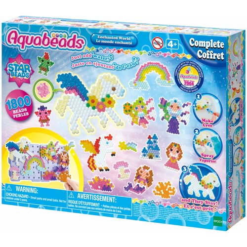 Познакомьтесь с миром творчества при помощи набора Aquabeads 31837 Зачарованный мир. Смотрите на подробную инструкцию, создавайте уникальные фигурки и наслаждайтесь творческим процессом. • Чтобы сделать игрушку из бусин, нужно выложить бусины на форму для бусин с шаблоном. • Бусины соединятся волшебным образом, если вы распылите на них воду с помощью распылителя. • Фигурки полностью высыхают за 60 минут • Готовые фигурки можно поместить на форму-дисплей, которая станет прекрасным дополнением домашнего интерьера. • Игровой набор станет отличным подарком для детей в возрасте от 4 лет и старше. • Игрушка имеет много мелких деталей, поэтому не подойдет детям младше 3 лет. • С помощью листа шаблонов создавайте фигурки русалок, принцесс, троллей, пегаса, феи и других мистических существ. • Игровой набор отлично развивает мелкую моторику, воображение и фантазию. В комплекте • 1800 бусин в 26 цветах • Палитра для бусин • Форма-дисплей • Крепежи для формы-дисплея • Форма-перевертыш • Бутылочка-распылитель для воды • Инструкция • Листы шаблонов Наборы бусин Aquabeads, соединяющихся с помощью воды, были созданы компанией Epoch Co, Ltd. в 2004 году.