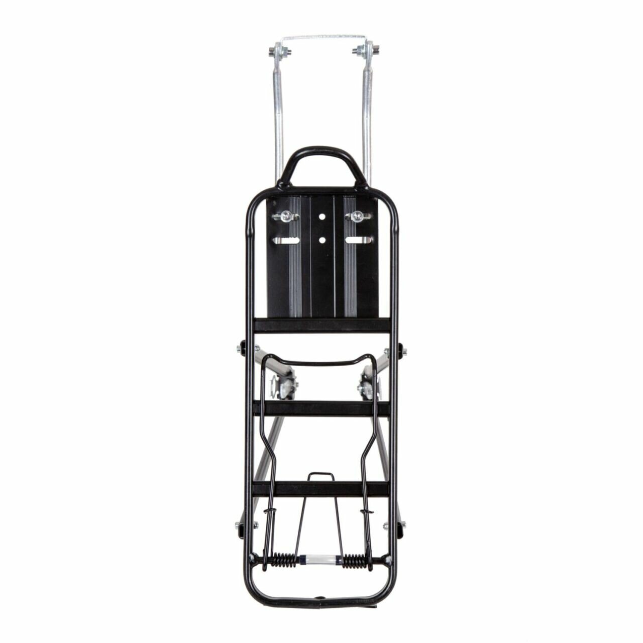 Задний багажник для велосипедов с колёсами 26-28". Багажник имеет пружинный зажим, который позволяет надежно зафиксировать груз.