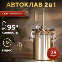 Автоклав домашний Заготовщик 2в1 28 литров - паровой стерилизатор с функцией самогонного аппарата подходит для приготовления любых заготовок. Готовьте за 1 раз до 24 банок в самом большом по вместимости автоклаве на пару всего за 30-60 минут. Дистиллятор Изюмовка лайт состоит из царги с дефлегматором димрота и холодильника. Следить за отбором основного продукта позволяет цифровой термометр в царге. Крышка автоклава-скороварки состоит из продуманной системы безопасности, которая содержит контроллер аварийного сброса, манометр, термометр, “дышащий” клапан, предохранительный датчик, диффузор – именно поэтому является универсальным инструментом на кухне.
