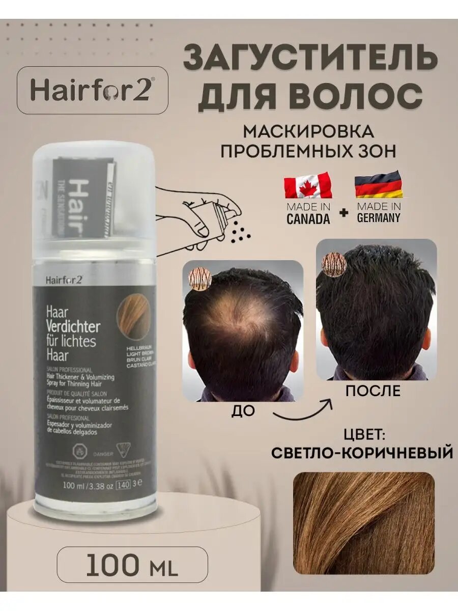 Hairfor2 – это уникальный загуститель в виде спрея, содержащий микроволокна, которые во время использования средства способны прочно соединяться с волосами.