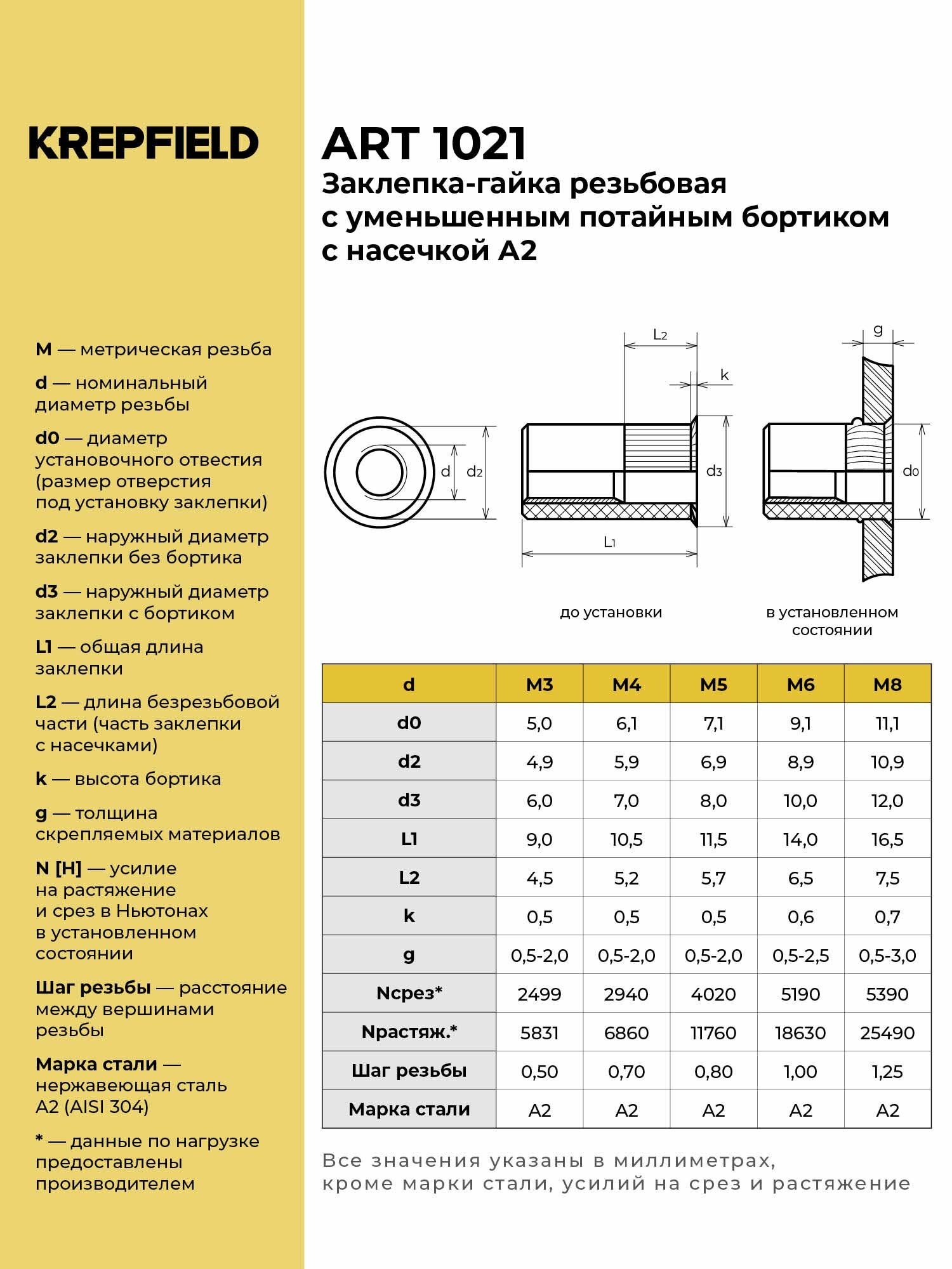 Заклепка резьбовая KREPFIELD Нержавеющая с уменьшенным потайным бортиком М5Х11,5 ART 1021 А2 100 шт.: сравнение цен, характеристики, фото, актуальное наличие и цены.