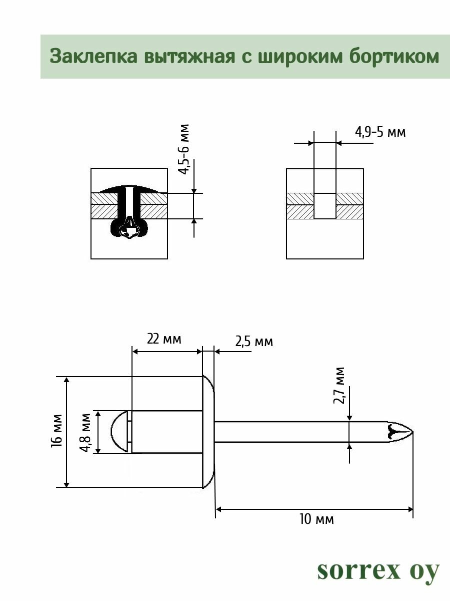 Заклепка вытяжная 4,8х10 с широким бортиком шляпкой 16 мм алюминий/сталь (500 штук) Sorrex OY