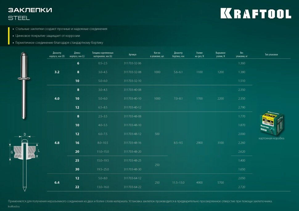 KRAFTOOL Стальные заклепки Steel, 6.4 х 22 мм, 250 шт, KRAFTOOL: сравнение цен, характеристики, фото, актуальное наличие и цены.