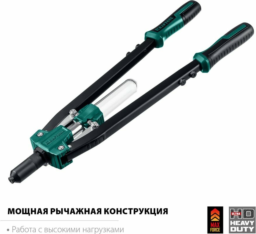Усиленный двуручный заклёпочник KRAFTOOL Grand-64, 520 мм, 3.2 - 6.4 мм, 311791 выдерживает большие нагрузки и предназначен для установки заклёпок из любых видов материалов при профессиональных и индустриальных работах.