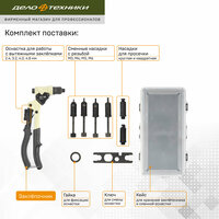 Заклёпочник позволяет скреплять листовые материалы вытяжными заклёпками, устанавливать резьбовые заклёпки, а также просекать пазы в металлах и пластинах.
