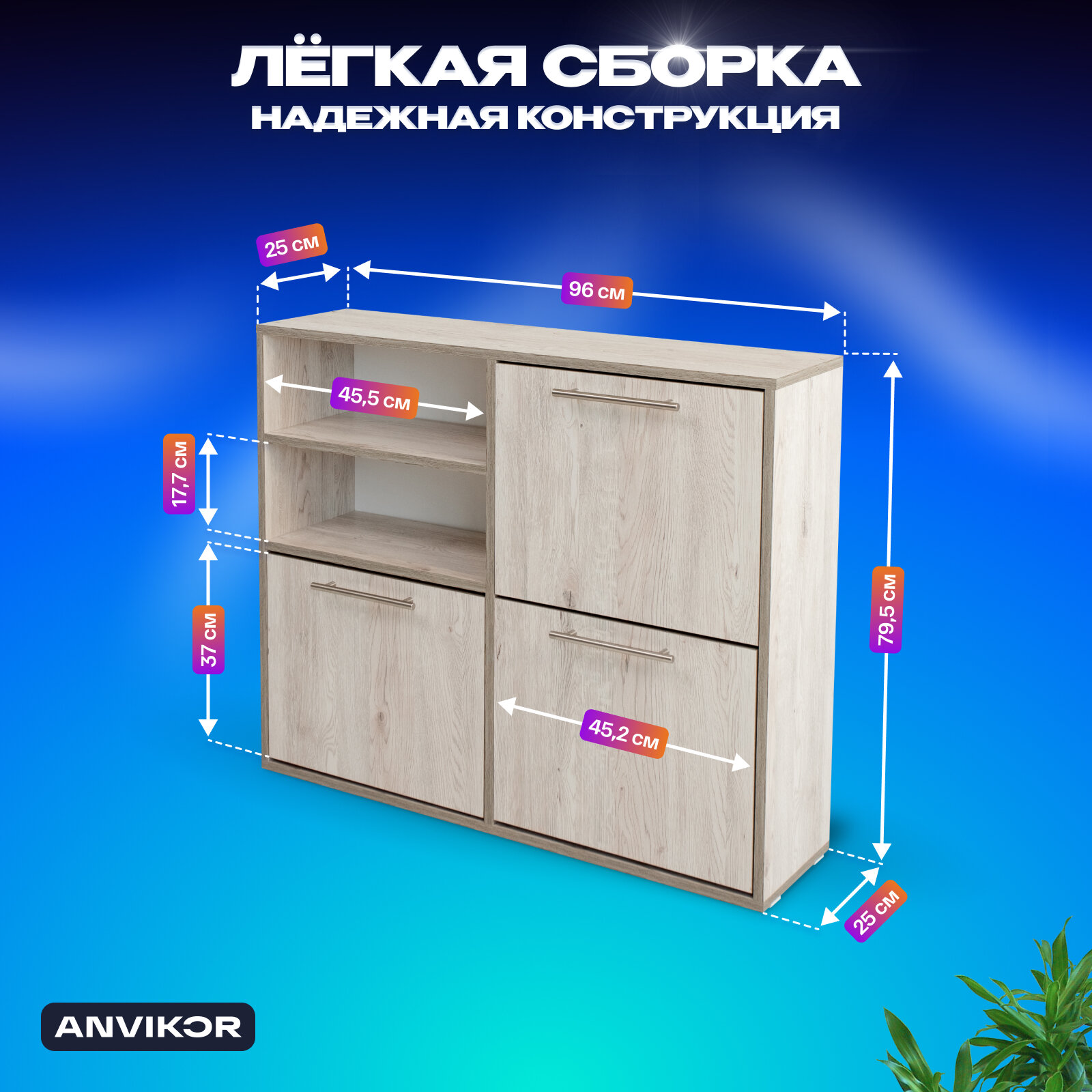 Закрытая обувница-тумба с полками «Талла» — идеальное решение для рационального хранения обуви в узком коридоре, компактной прихожей или гардеробной. Надежная конструкция включает две секции с двойными откидными дверцами, секцию с распашной дверцей и секцию с двумя открытыми полками. Обувница-тумба вмещает до 12 пар обуви, а открытые полки позволяют хранить различные мелочи: ключи, сумки, зонты, чистящие средства для обуви. Эргономичная и функциональная обувница изготовлена из прочного ЛДСП. Удобный механизм открывания ящиков, крепкие петли и хромированные ручки гарантируют надежность и комфорт от использования. Пластиковые протекторы обеспечивают защиту пола от вмятин и царапин. Качественные и экологичные материалы, а также стильный современный дизайн делают закрытую обувницу подходящей для любого интерьера дома, дачи, офиса, салона красоты, медицинского или косметологического кабинетов. С закрытой обувницей в прихожую можно организовать безупречный порядок и сохранить обувь в отличном состоянии, сэкономив пространство и дополнив его интересным акцентом.