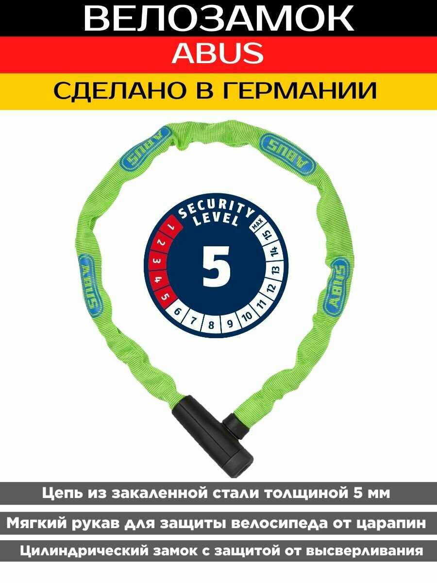 Велозамок ABUS Steel-O-Chain 5805K — каленая цепь со звеньями квадратного сечения 5 мм, длиной 75 или 110 см, затянутая в тканевый рукав для сохранения лакокрасочного покрытия рамы. Цилиндрический замок с 2-мя ключами и уровнем стойкости 4 подходит при низком риске кражи.