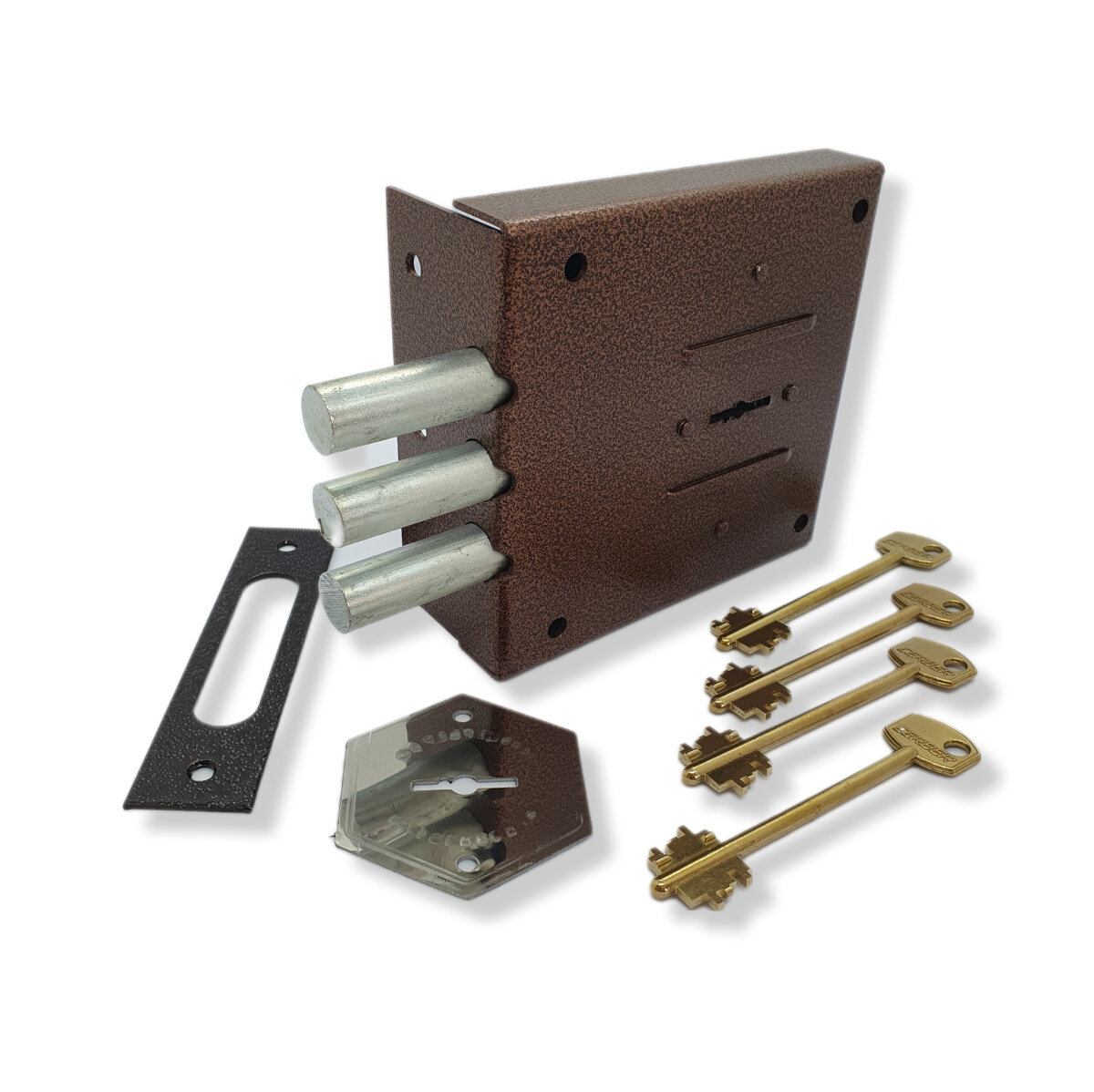 Надежный дверной и гаражный замок накладной сувальдный с симметричным ключом CERBER С1-М БЗ (ЗНУ-М 016) без запорной планки. Вылет засовов - 40 мм. Габариты: 130х135х24мм. В комплекте 4 ключа. Сохраняет работоспособность при поломке пружин, при смерзании и коррозии стопорного механизма. Оригинальная конструкция не дает возможности открыть замок при помощи высверливания через кондуктор (стопорная стойка закалена), отмычкой по щелчкам, снять слепок формы бородок через замочную скважину.