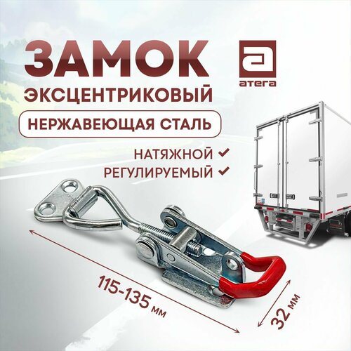 Эксцентриковый натяжной замок-фиксатор с петлей для пломбы или замка из нержавеющей стали. Ответная часть (крючок-петля) в комплекте. Применяется в производстве и ремонте фургонов, производстве специальных автомобильных кузовов, прицепов.