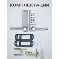 В комплект поставки входят все необходимые элементы для установки замка: внешняя часть с кодовой панелью и ручкой, внутренняя часть, две резиновые накладки, врезной механизм, ответная часть в косяк двери и крепеж.