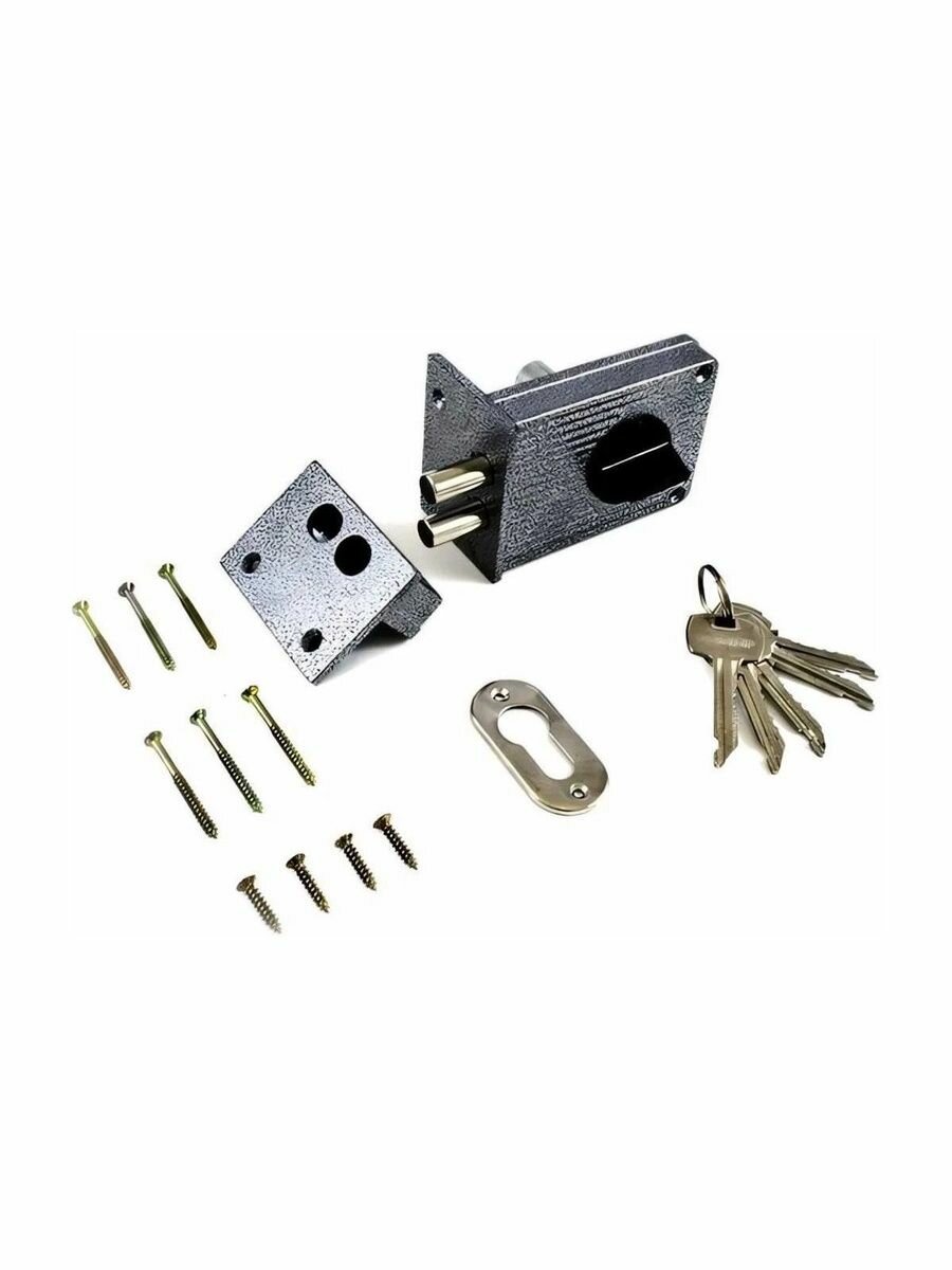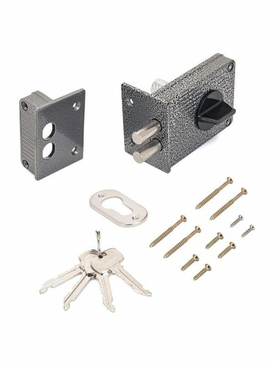 Накладной, цилиндровый, с вертушкой. Предна- значен для установки на деревянные двери. Два круглых ригеля диаметром 12 мм, с максималь- ным вылетом 24 мм. Удаление ключевого от- верстия - 56 мм. Габариты замка - 110х72х18,5 мм. Комплектация - 5 ключей, запорная планка, накладка. Механизм замка под англ. ключ, идет совместно с корпусом. Закрывание и открывание замка изнутри производится вертушкой, снаружи ключом. Совпадает по посадочным отверстиям с замком ЗН1А-1М Казань. Материал: сталь, пластик. Упаковка: картонная коробка.