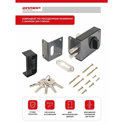 Замок накладной цилиндровый с вертушкой. Предназначен для установки на деревянные двери. Засов из двух цилиндрических ригелей диаметром 12 мм, с максимальным вылетом 30 мм. Удаление ключевого отверстия - 60 мм. Габариты замка - 100х74х24 мм. Комплектация - 5 ключей, запорная планка, накладка. Механизм замка под англ. ключ, идет совместно с корпусом. Закрывание и открывание замка изнутри производится вертушкой, снаружи ключом. Совместим по посадочным местам с замком ЗН1-1 Пенза.