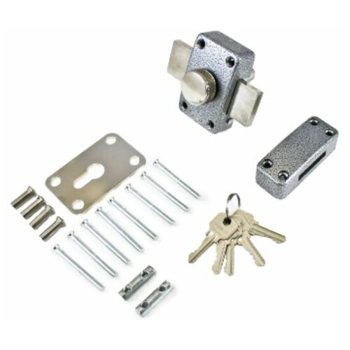 Замок накладной цилиндровый с вертушкой. Предназначен для установки на деревянные двери. Засов - цельный прямоугольный стальной ригель, общей длиной 114мм. Габариты корпуса замка - 90х56мм. Комплектация - 5 ключей, запорная планка со стяжками, наружная накладка со стяжными болтами. Механизм замка под англ. ключ, идет совместно с корпусом. Закрывание и открывание замка изнутри производится вертушкой, снаружи ключом. Имеет фиксатор, которым можно полностью блокировать замок. Совпадает по посадочным отверстиям с замком ELP Казань.