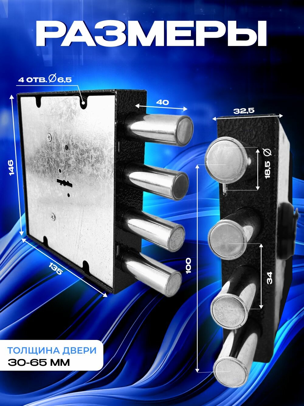 Замок - 1шт. Ключи - 4шт. Ответная планка - 1шт. Накладка наружная - 1шт. Крепеж- 1шт. Руководство по эксплуатации- 1 шт.