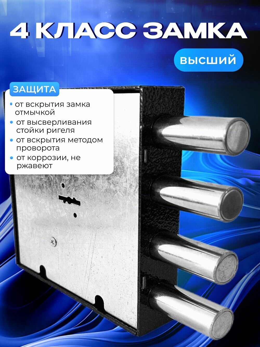 Замок накладной ЗН4-ГС-1 СенатЗамок гаражный сувальдный ЗГС-1 (ЗН4-ГС-1)Открывается и закрывается с наружной и внутренней сторон двумя полными оборотами комплектного ключа. Засов изготовлен из 4-х стальных стержней круглого сечения, приваренных к пластине ригеля. Базовая комплектация предусматривает защиту от вскрытия замка отмычкой, защиту от высверливания стойки ригеля и защиту от вскрытия методом проворота. Имеет накладку с внутренней стороны на замочной скважине. Не имеет лицевой планки.3 ключаЗамок накладной ЗН4-ГС-1 Сенат