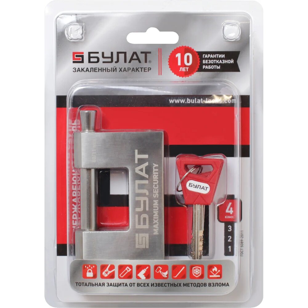 Замок навесной «булат» предназначен для объектов, где требуется высочайший уровень защиты и безопасности (армейские склады и объекты вооруженных сил, железнодорожные вагоны, грузовые автомобили, контейнеры, гаражи и пр.). Надежно работает в экстремальных условиях (морской климат, загрязненная атмосфера и пониженные температуры). Замок обладает длительным сроком эксплуатации. Гарантийный срок 10 лет Корпус П-образный из нержавеющей стали марки SUS304, твердость 61 HRA, не подвержен коррозии. Тест на коррозионную стойкость: более 1000 часов в камере соляного тумана. Дужка (прямая) из нержавеющей стали марки SUS304, твердость 61 HRA , обеспечивает высокую сопротивляемость силовым методам взлома. Максимальное усилие на разрушение гидравлическим инструментом 20 тонн Двойной механизм фиксации дужки замка с помощью шариков из нержавеющей стали SS304. Устойчивость на вытягивание не менее 15000 кН. Дисковый цилиндр с запатентованной (Patent: ZL2016 2 0945672.4) защитой от разрыва и несанкционированного доступа. Секретность не менее 200 000 комбинаций, работоспособность более 100 000 циклов. Запирание замка не автоматическое.