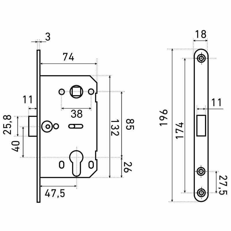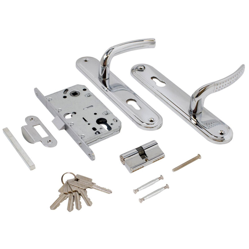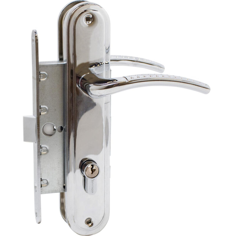 Врезной замок с ручками с пониженным уровнем шума при работе. Предназначен для установки в деревянные двери толщиной до 40 мм. Универсальный засов-защелка из ударопрочного пластика. Корпус из оцинкованной стали. Межосевое расстояние - 85 мм. Удаление ключевого отверстия - 50 мм. Материал ручек — алюминиевый сплав , накладки — сталь. Многослойное гальваническое покрытие. Комплектация: замок, ручки, ответная планка, винтовые стяжки, цилиндровый механизм 60мм. Гарантийный срок эксплуатации — 3 года.