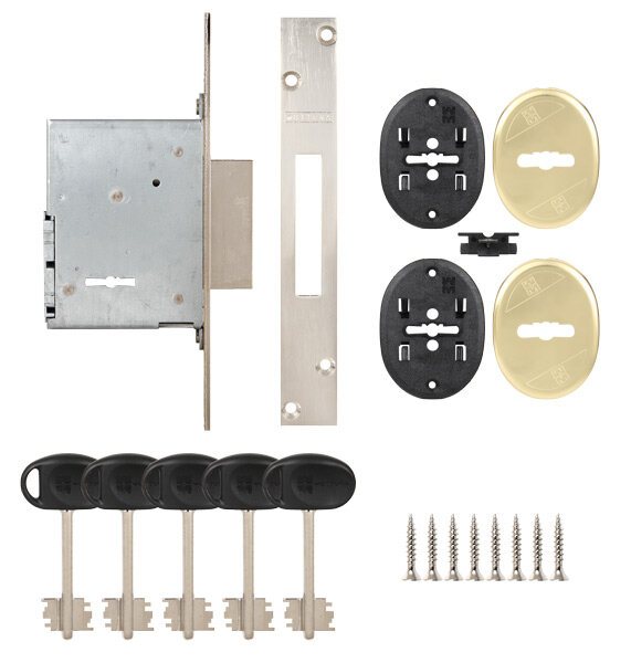 Mottura 40.751.42 Замок врезной сувальдный для металлических, деревянных и пластиковых дверей, в комплекте с накладками. Несмотря на свой небольшой размер и легкость замок имеет 6 сувальд, закрывается на два оборота. Все модели этой группы товаров пользуются высокой популярностью на рынке. Mottura - компания производитель премиальных итальянских замков высшего качества.