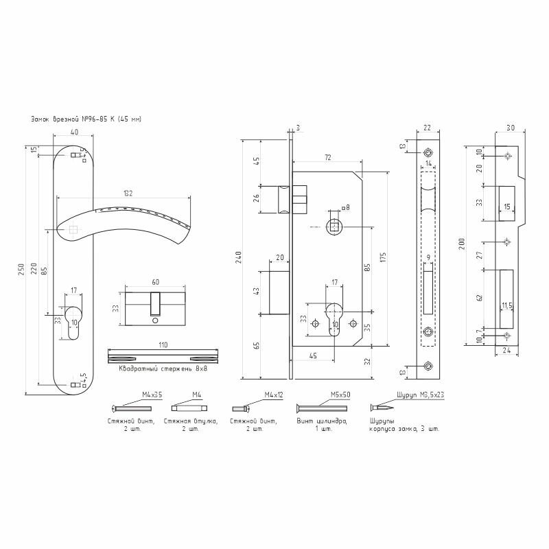 Комплект замка предназначен для установки в деревянные входные двери. В комплект входят 2 ручки на планке, корпус замка, ответная планка, цилиндровый механизм и 5 ключей. Межосевое расстояние 85 мм. Комплект универсальный, можно устанавливать на двери левого и правого типа открывания. Цилиндр и ключи выполнены из латуни, ручки на планке - сталь, алюминий, корпус стальной, механизм из закаленной стали. Гальваническое многослойное покрытие лицевых деталей, корпус замка имеет защитное антикоррозийное напыление. Гарантия на работу изделия 5 лет.
