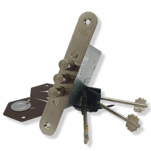 Замок врезной 80100 8и сувальдный. Предназначен для установки в деревянные и металлические двери. Три цилиндрических ригеля диаметром 11мм, вылет 21мм. Удаление ключевого отверстия: 51мм. Стальной оцинкованный корпус. Ширина торцевой планки 22мм. Заявленная секретность 250 000 кодовых комбинаций. Замок имеет защиту от высверливания. Изготовлен из высокопрочных материалов. 3 ключа.