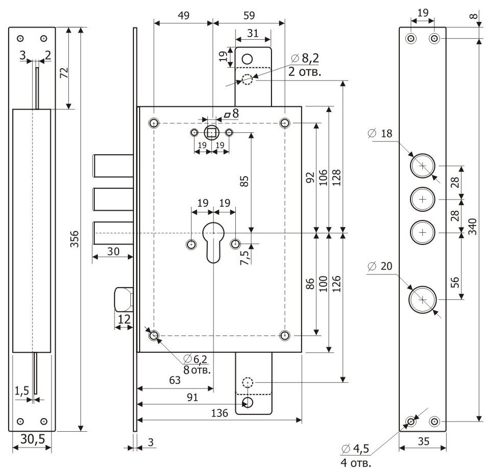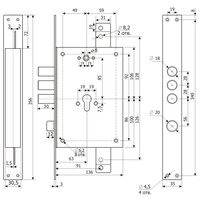 оличество ригелей 3 Вылет ригелей 26 мм Диаметр ригеля 15.8 мм Удаление ключевого отверстия (Backset) 57 мм Тип механизма секретности Сувальдный Количество ключей 4 шт Защелка Отсутствует Левый/Правый Универсальный Автоматическое запирание Не автоматическое Количество точек запирания 1 Класс по ГОСТ 2 Защита от отмычек Да Защита от высверливания Да Защита от сворачивания Да