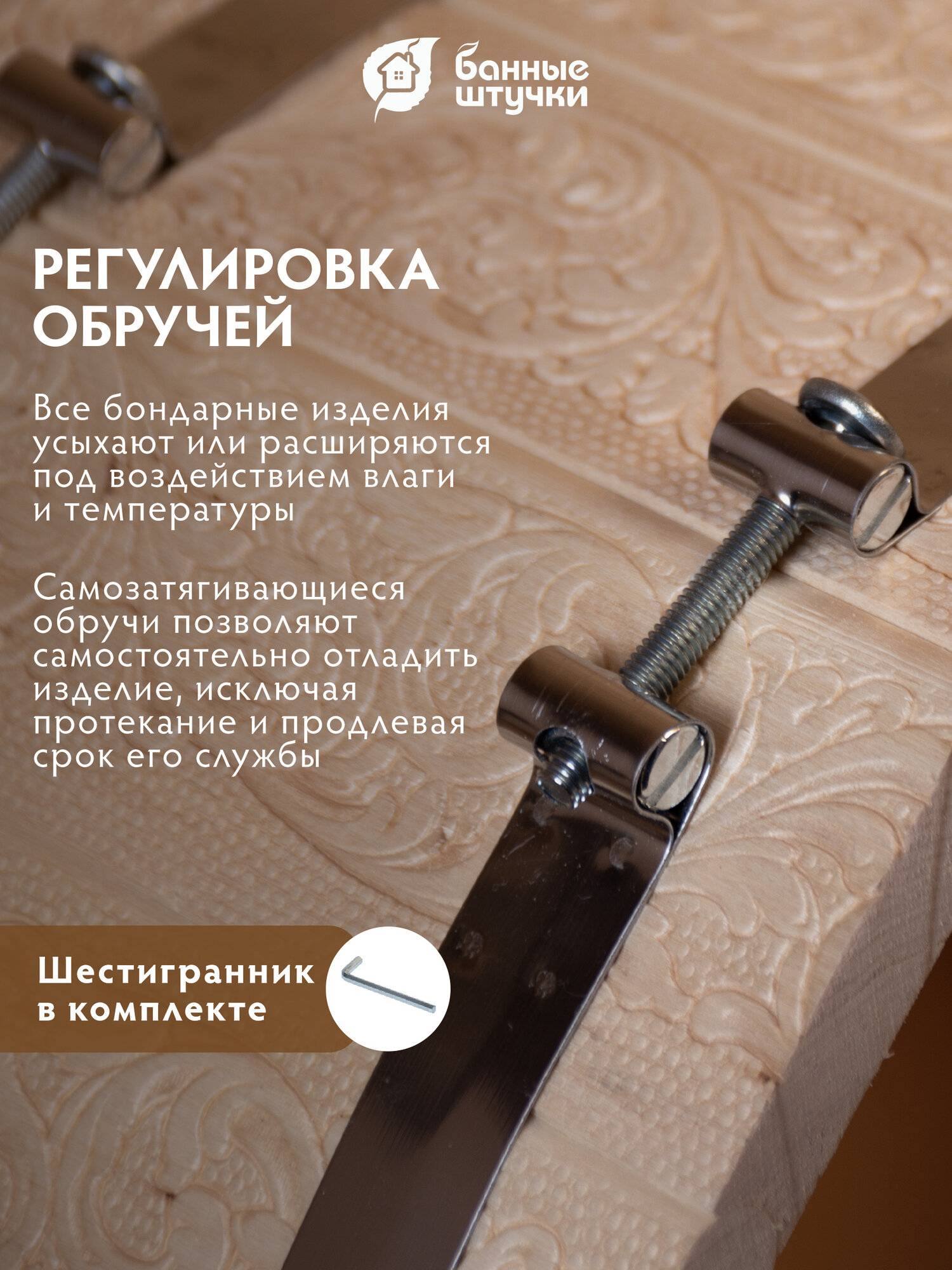 Особенностью запарника является система регулировки обручей. Самозатягивающиеся обода позволяют сохранить продукцию в случае усыхания древесины липы, что обеспечивает долговечность изделия.
