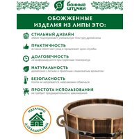 - Изготовлен из натуральных материалов. - Липа обладает целебными свойствами и сохраняет комфортную температуру. - Удобная форма и объем. - Пластиковая вставка обеспечивает долговечность и удобство использования. - Подходит для запаривания веников, трав и других банных принадлежностей. - Не требует особого ухода и легко моется.