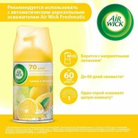 Описание товара: Наполните дом дом освежающим ароматом лимона с нотками женьшеня с Air Wick "Лимон и женьшень". Вставьте сменный баллон в элегантное устройство, выберите интенсивность распыления, и Air Wick Freshmatic будет бороться с неприятными запахами* автоматически день за днем. Преимущества автоматического освежителя Air Wick Freshmatic: - До 60 дней свежести**; - 1 спрей освежает целую комнату***; - Рекомендуется использовать с автоматическим аэрозольным освежителем Air Wick Freshmatic. *На основании отчета исследовательского центра Рекитт Бенкизер (Халл, Великобритания) от 23 августа 2018 года в отношении запахов в туалете, на кухне, а также животных. **Эффективен до 60 дней при низком уровне интенсивности аромата и нормальных условиях окружающей среды. ***1 спрей освежает помещение объемом 28 м3 согласно данным исследовательского центра Рекитт Бенкизер, отчет №зк-14-04-02 от 27.03.2014 г. Состав товара:30% и более: бутан, пропан, этиловый денатурированный спирт; менее 5%: ароматизатор, d-лимонен, цитраль, линалоол. Меры предосторожности: Используйте только по назначению. Внимательно прочтите меры предосторожности к сменному аэрозолю. Перед тем, как ставить аэрозоль, проверьте, что диспенсер выключен. Не направляйте в лицо при включении или при установке интервала распыления. Баллончик находится под давлением. Установите регулятор интенсивности аромата в положение "Off" перед тем, как вставить сменный аэрозоль. Во время работы устройства не вставляйте в него пальцы или какие-либо предметы. Если Вы покидаете дом более, чем на неделю, выключите устройство, повернув переключатель в положение "Off" (при этом обнуляется счетчик распылений). Используйте только щелочные батарейки. Никогда не используйте батарейки разных типов или производителей. Берегите батарейки от воды, огня и воздействия высоких температур. Если батарейки текут, немедленно выньте их и удалите все подтеки. Вынимайте батарейки, если устройство долго не используется. Не распылять вблизи открытого огня и раскаленных предметов. Не устанавливать и не оставлять вблизи источников тепла, электрического оборудования. Избегайте попадания прямых солнечных лучей и нагревания выше 50ºС. Не вдыхать спрей. Не разбирать и не давать детям! При попадании в глаза промыть осторожно водой в течение нескольких минут. Использовать только в проветриваемых помещениях. Не прокалывайте и не сжигайте после использования. В случае попадания спрея на поверхности, немедленно протрите сухой тряпкой. Не распыляйте на еду или ткань. При обращении к врачу иметь при себе упаковку или этикетку. Использовать только по прямому назначению. Не вдыхать аэрозоль. Преднамеренное вдыхание содержимого может быть вредным или смертельным. Утилизировать вместе с бытовыми отходами. Способ применения: Используйте только с диспенсером Air Wick Freshmatic. Перед тем, как вставить аэрозоль, проверьте, что диспенсер выключен. Не направляй