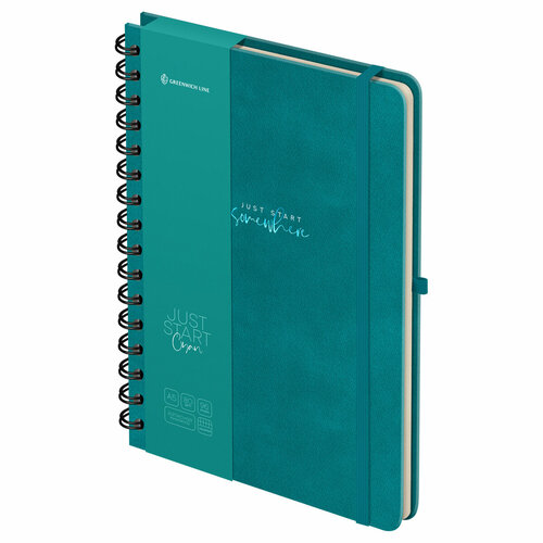 Стильная записная книжка Greenwich Line Just start. Cyan А5 формата на гребне с мягкой обложкой будет не только особенным аксессуаром, отражающим стиль владельца, но и незаменимым помощником в работе и учебе. Мягкая обложка из приятной искусственной кожи с эффектом замши имеет скругленные уголки. Застежка резинкой плотно фиксирует обложку. Удобное крепление на на гребне позволит раскрыть книжку на 360 градусов и удалять ненужные листы, не повредив при этом сам блок. Внутренний блок в клетку на 96 листов (192 страницы) - из высококачественной бумаги цвета слоновой кости плотностью 80 г/м2 с скругленными уголками. Петля для ручки сделает ваши записи более удобными. Записная книжка представлена в размере 143*210 мм и имеет индивидуальную упаковку.- Формат А5 на гребне;- Твердая обложка кожзам с эффектом замши с тиснением фольгой;- Блок в клетку;- Плотность блока 80 гр/м2;- Петля для ручки. Линовка: клетка Пол: универсальный Материал обложки: искусственная кожа Тиснение фольгой: есть Размер: 143*210 мм Расположение крепления: сбоку слева Цвет обложки: рисунок Внутренний блок: офсетная бумага Цвет бумаги блока: тонированный Плотность блока: 80 г/кв. м Печать блока: 1 краска Тип застежки: резинка Индивидуальная упаковка: есть Формат: А5 Тип скрепления: гребень/спираль Тип обложки: твердая Количество листов: 80
