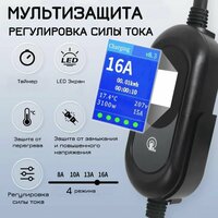 - Регулировка тока: Возможность выбора между 8, 10, 13 и 16 А позволяет настроить оптимальный режим зарядки в зависимости от потребностей и возможностей электросети.