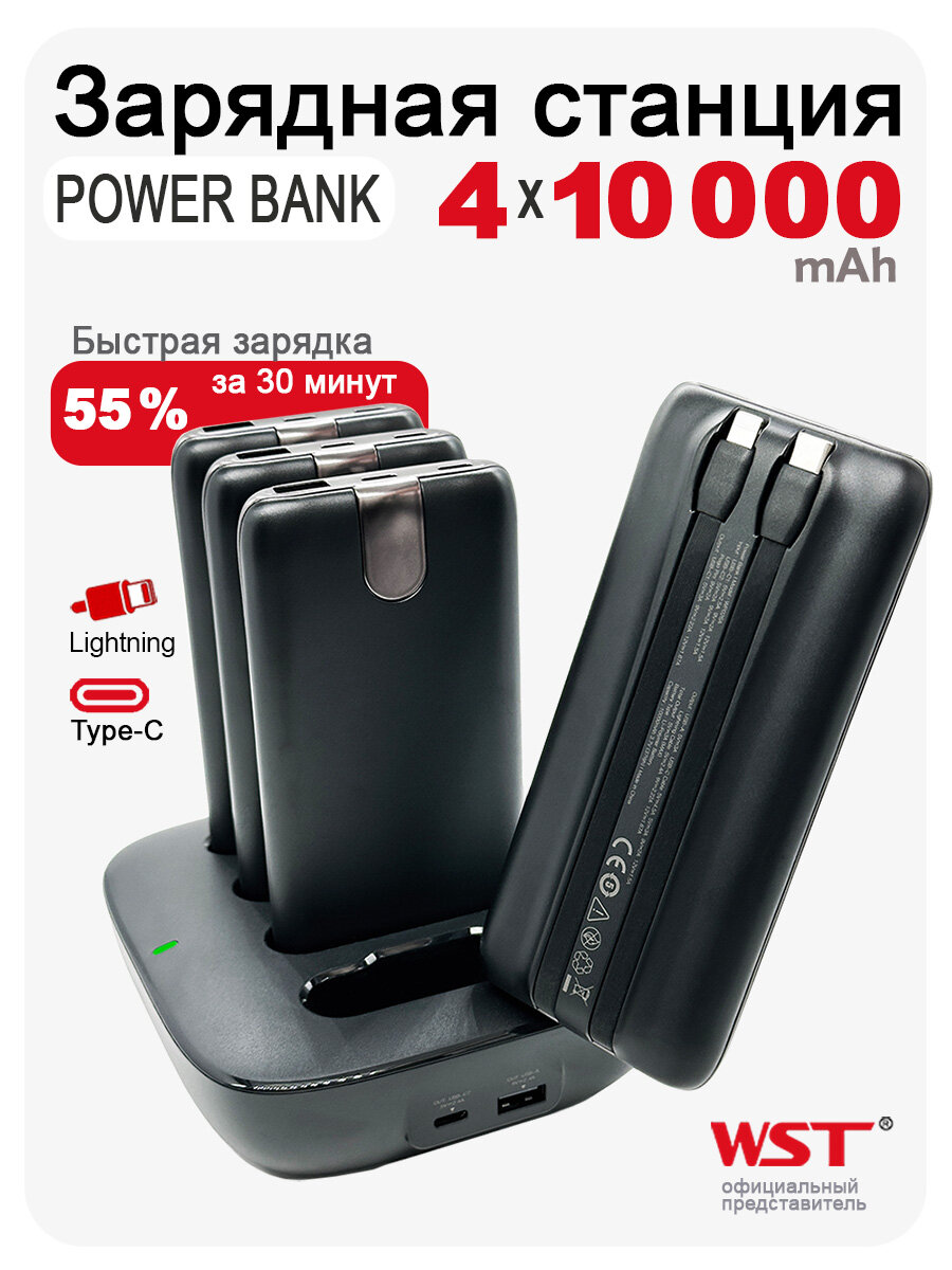Зарядная станция для внешних аккумуляторов 10000 mAh WST WP0264 с коннектором Type-C и Lightning комплект из 4 PowerBank, черная: сравнение цен, характеристики, фото, актуальное наличие и цены.