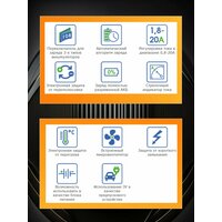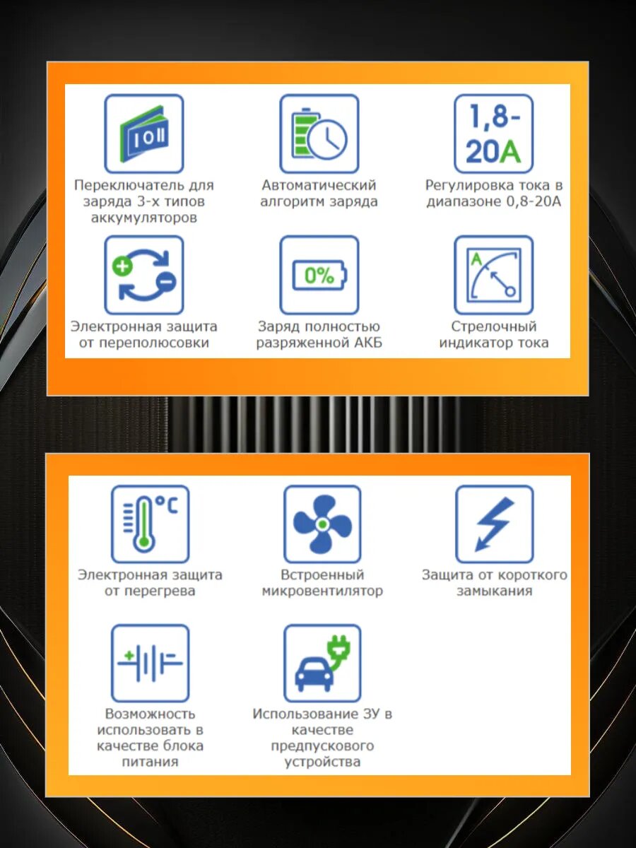 автоматическое отключение зарядки, встроенный амперметр, встроенный вольтметр, подходит для AGM/GEL аккумуляторов, предпусковая зарядка, режим зимней зарядки