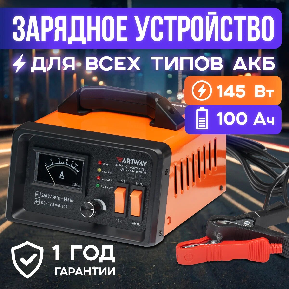 Зарядное устройство Artway CCH10 подходит для аккумуляторов с напряжением 6/12 В и емкостью от 100 до 60 Ач. Максимальная емкость аккумулятора, которую можно зарядить с помощью этого устройства, составляет 100 Ач.