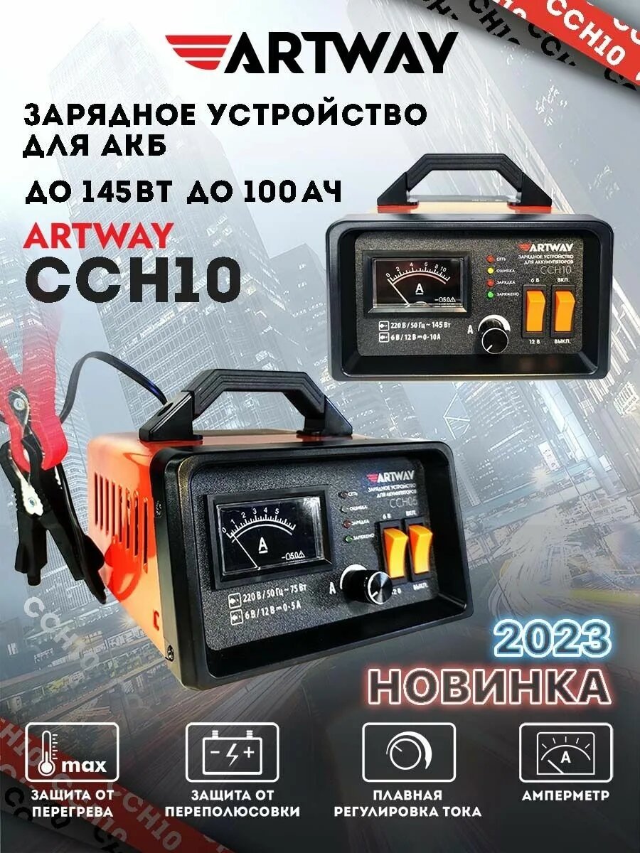 Зарядное устройство Artway CCH10 - это электронное устройство, предназначенное для заряда аккумуляторов и аккумуляторных батарей энергией внешнего источника. Оно обеспечивает плавную регулировку тока заряда, защиту от неправильного подключения к клеммам аккумулятора и от перегрева, а также защиту от короткого замыкания.
