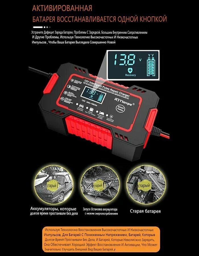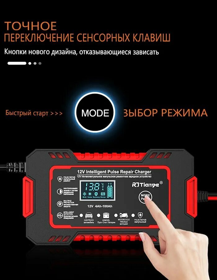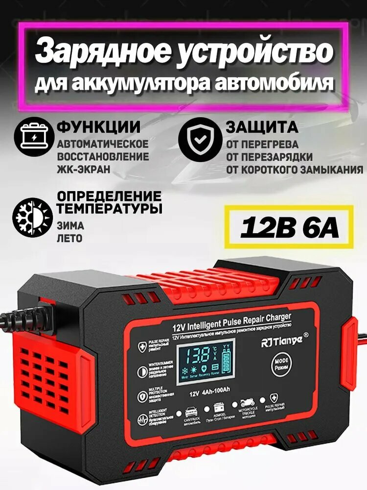 Автоматическое зарядное устройство для автомобильного аккумулятора 12B 6A, 4-100 Ач, с LCD дисплеем, защитой от перегрева и обратной полярности, красный: сравнение цен, характеристики, фото, актуальное наличие и цены.