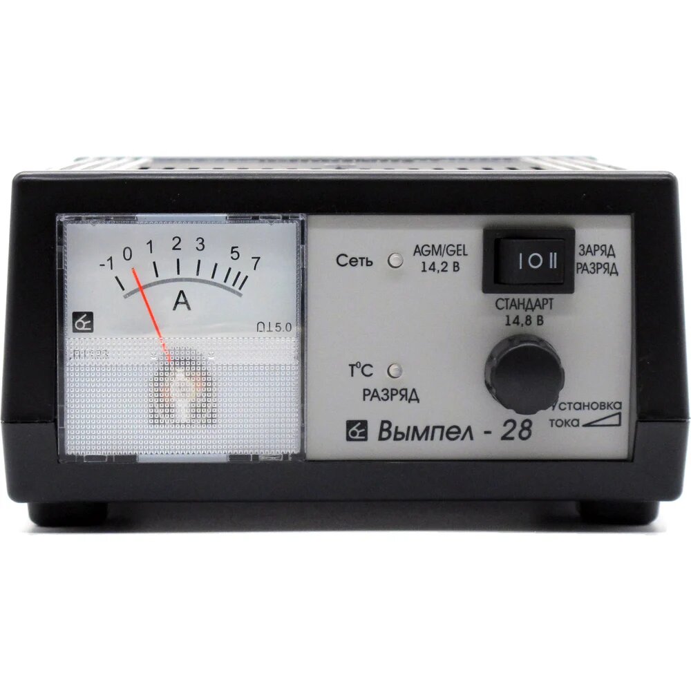Зарядное устройство для аккумуляторов автомобиля Вымпел 28 предназначено для заряда автомобильных (12 В) кислотных аккумуляторных батарей, тяговых и лодочных АКБ, АКБ типа AGM, EFB, АКБ с гелевым электролитом: Long Life, Deep-Cycle, в том числе полностью разряженных (до нуля), различной емкости, как в полностью автоматическом, так и в неавтоматическом режиме с возможностью ручной регулировки силы зарядного тока.